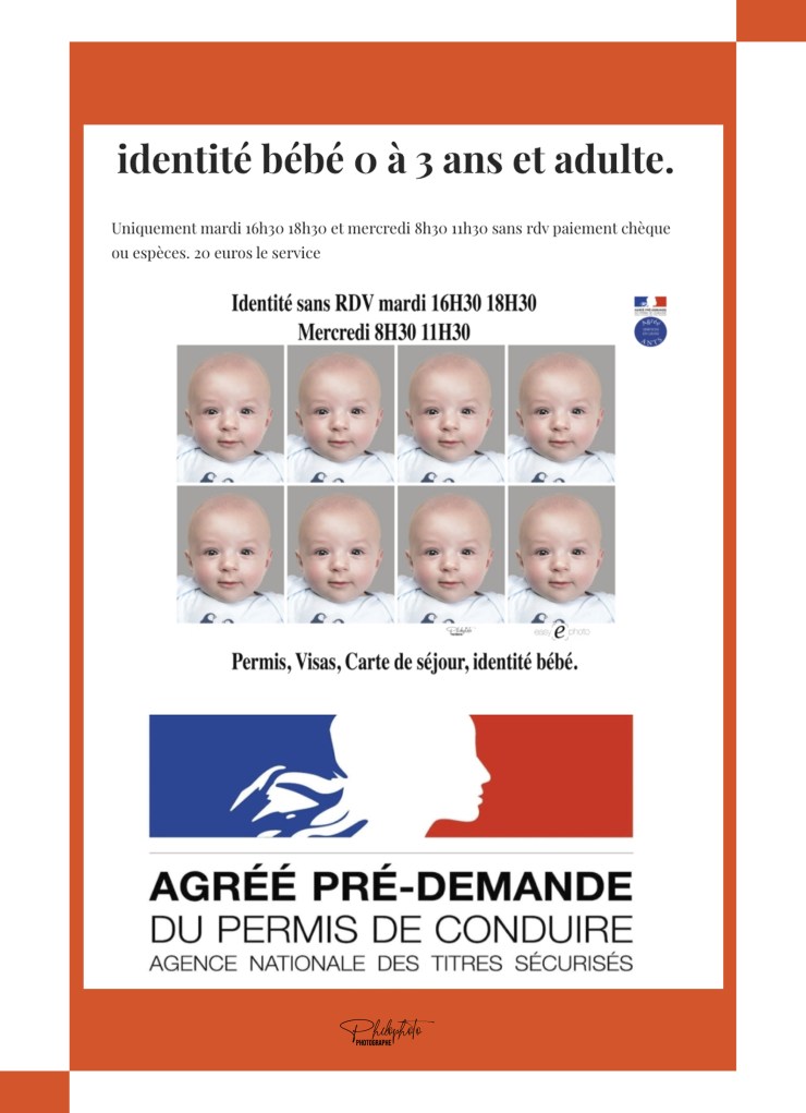 identité bébé 0 à 3 ans et adulte. Uniquement mardi 16h30 18h30 et mercredi 8h00 12H00 sans rdv paiement carte bancaire, ou espèces. 20 euros le service ← RetourMerci pour votre réponse. ✨ Nom(obligatoire) E-mail(obligatoire) Site web Message Δ
